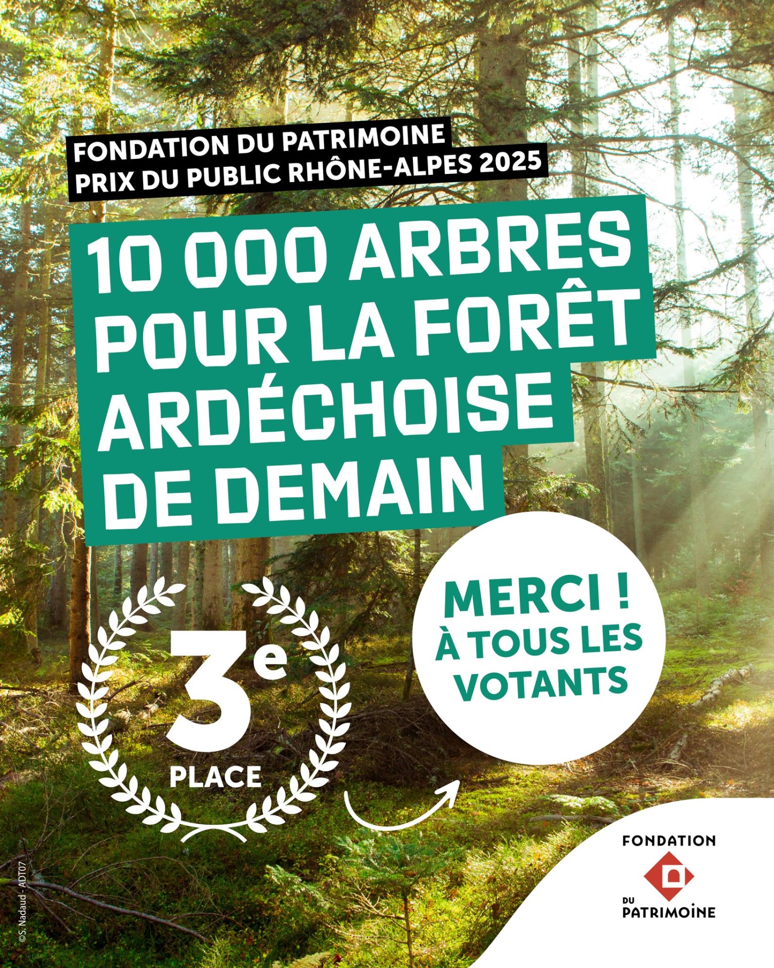 Le projet « 10 000 arbres pour la forêt ardéchoise de demain » a remporté la 3ᵉ place du Prix du Public Rhône-Alpes 2025, organisé par la Fondation du patrimoine.